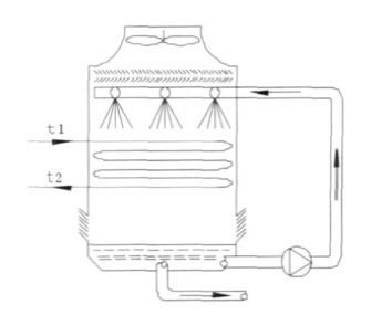 閉式冷卻塔的工作原理主要是基于蒸發冷卻技術,其設計來源于工業上使用的蒸發冷卻器。冷凝器、吸收器或工藝設備的高溫水通過水泵或其他壓力裝置產生的壓力輸送到冷卻塔的冷卻線圈,循環水進入冷卻塔。通過冷卻塔內的運動和通過與空氣流體的接觸來交換