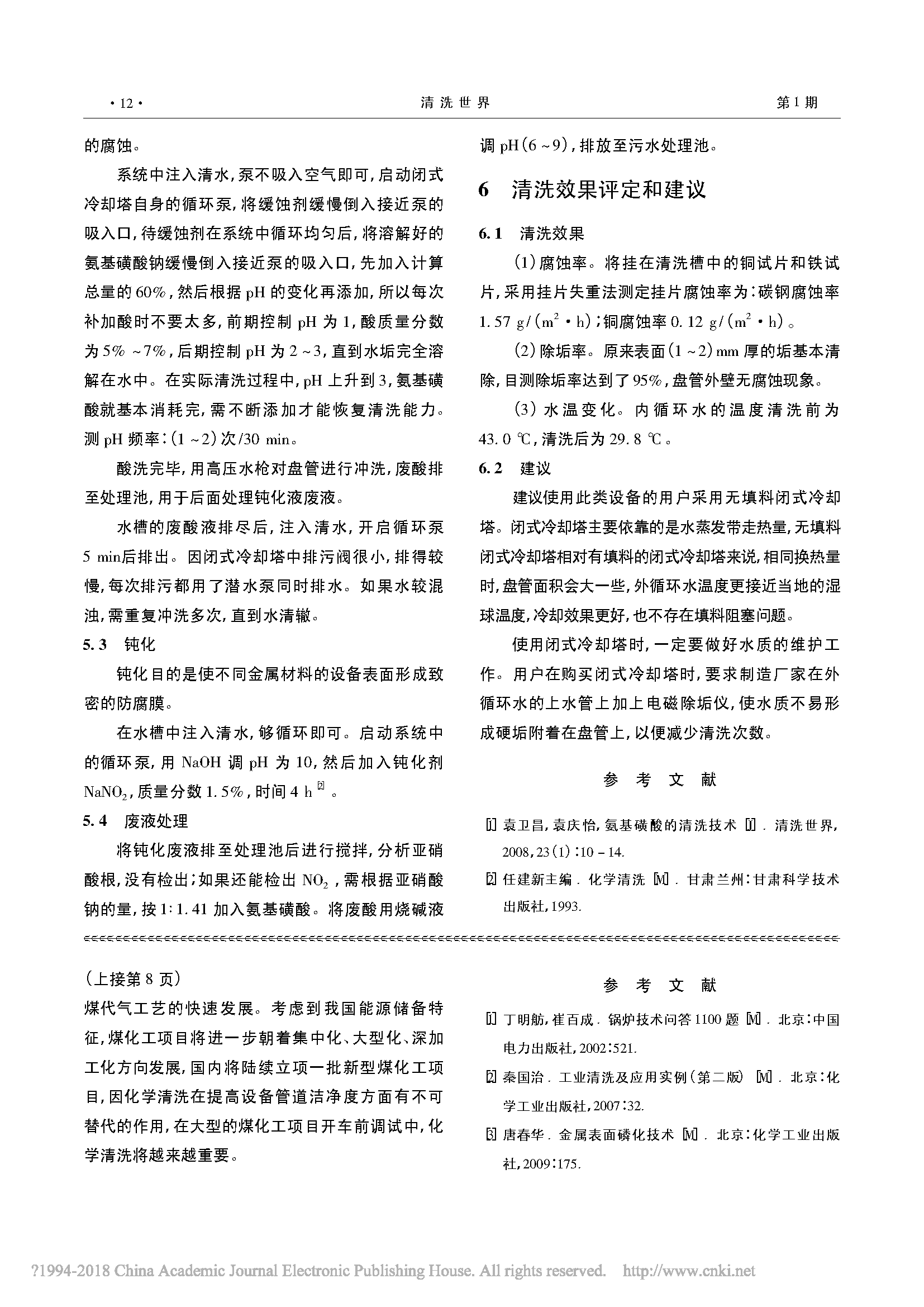 以重慶杰信鍛造有限公司閉式冷卻塔為例,介紹閉式冷卻塔清洗方法。利用閉式冷卻 塔的外循環泵形成清洗回路,采用氨基磺酸加緩蝕劑進行清洗,鈍化液直接用清洗廢液處理,保 證了清洗過程的安全和環保。...