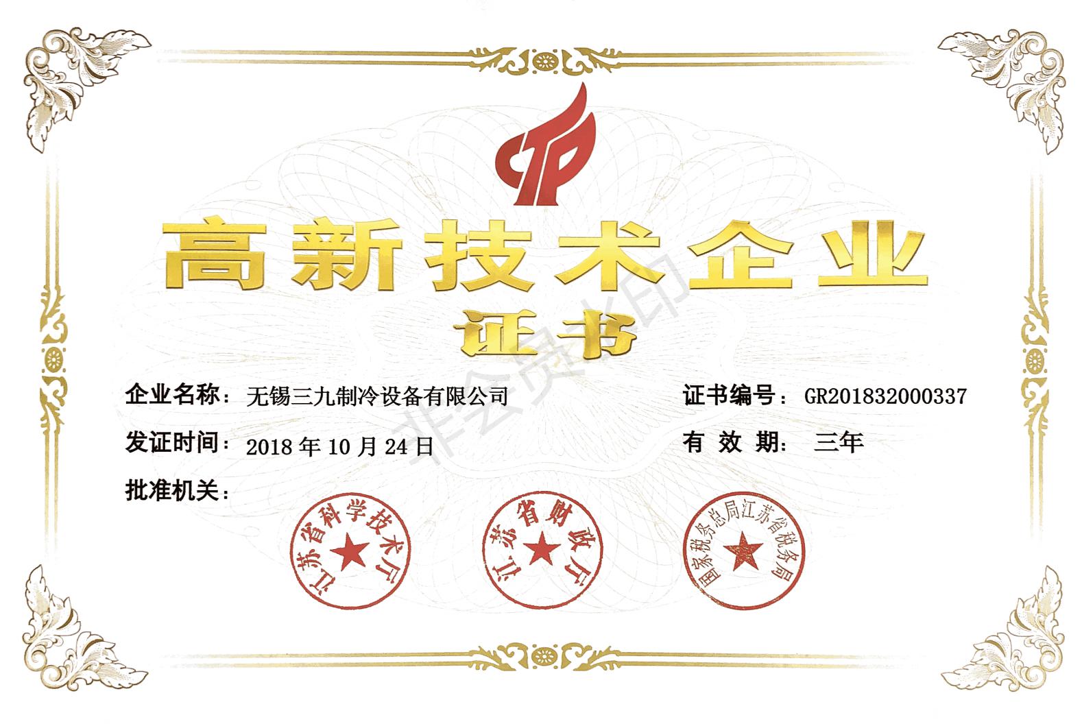 熱烈祝賀無錫三九制冷設備有限公司獲得高新技術企業證書