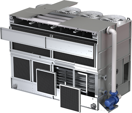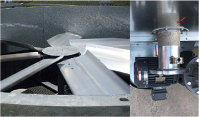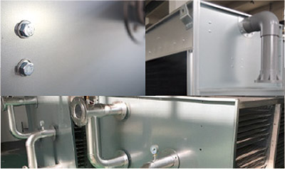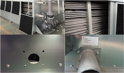 - 冷卻器整體位于預(yù)冷填料的下方,設(shè)備重心低,穩(wěn)定抗振,且可從外部檢查和沖洗